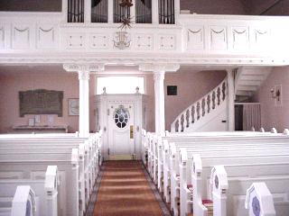 Der Aufgang über die Holztreppe zur Empore und zur Orgel ist ebenfalls weiß gestrichen. So wird der Besucher von jedem Platz im Kirchenschiff von der weißen Farbgebung beeindruckt.