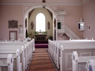 Die Kirchenbesucher kommen durch einen Windfang und betreten über eine schöne Holztür das Kirchenschiff. Überrascht vom hellen Licht, das die Kirche ausstrahlt, schaut sich der Besucher um. Die weiße Farbe beherrscht das Bild und vermittelt dem Gläubigen den Eindruck von Wärme und Geborgenheit.
