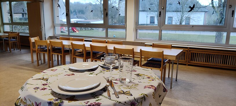 Die große Küche verfügt über mehrere Kühlschränke, einem Herd und einer Geschirrspülmaschine, Geschirr, Handtücher, Besteck und sonstiges ist natürlich auch vorhanden. Der Gemeinderaum verfügt über einen Raum mit insgesamt 60 Sitzplätzen. Stühle und Tische sind vorhanden und stehen natürlich auch zur Benutzung bereit. Der Raum und die Küche sind zusätzlich mit einer Durchreiche verbunden um sich so einige Arbeit und Fußwege zu sparen und erleichtern.